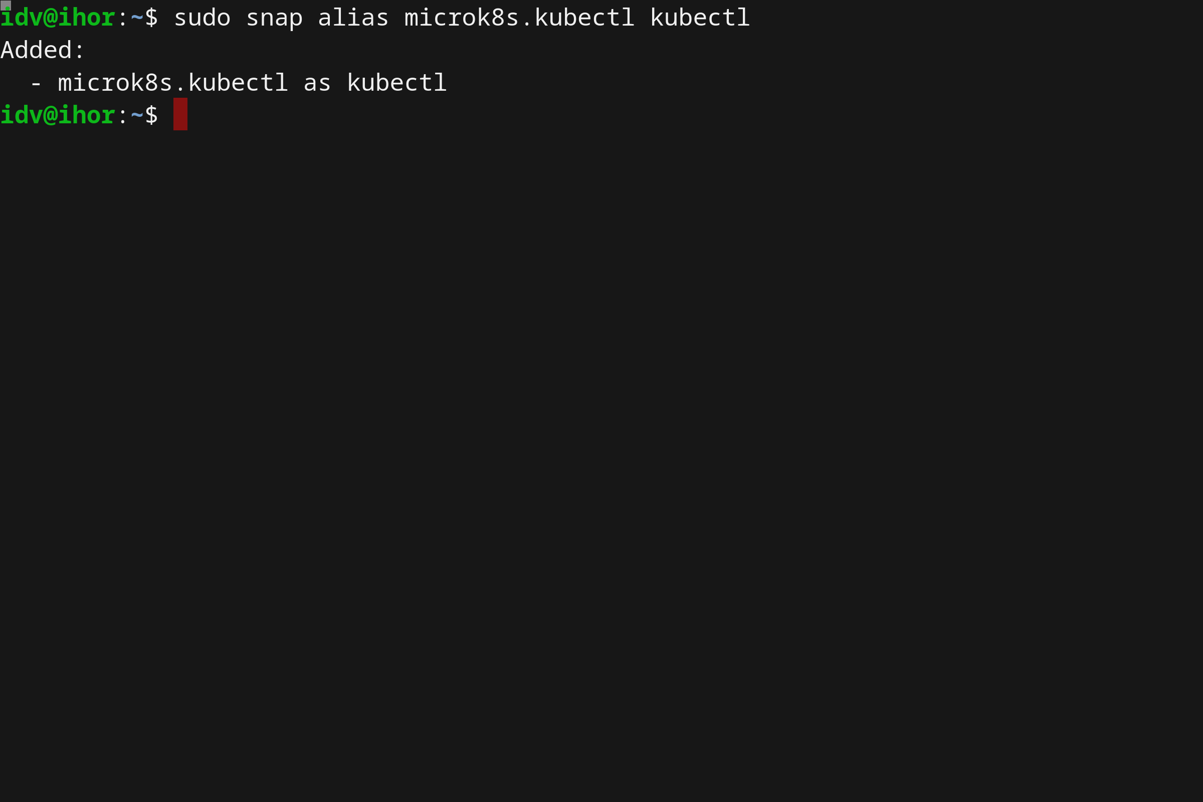 sudo snap alias microk8s.kubectl kubectlThis will allow you to simply use kubectl after. You can revert this change using the snap unalias command.